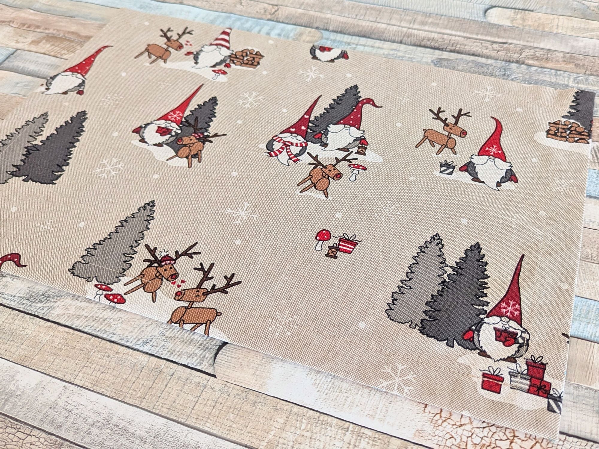 Unsere liebevollen Platzdecken im warmen Beigeton mit charmanten Wichtel-, und Rentier-Motiven verbreiten eine verspielte Weihnachtsstimmung.