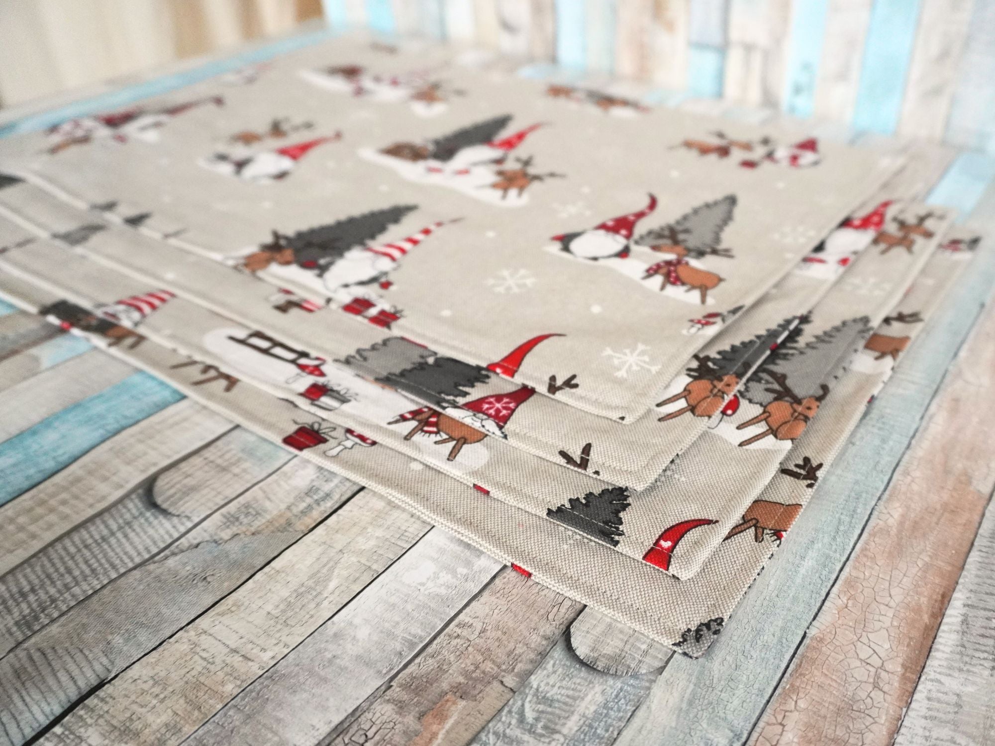 Die Weihnachtsunterlagen bestehen aus einer robusten Baumwollmischung in Leinenoptik und eignen sich wunderbar für den täglichen Gebrauch in der Adventszeit und für besondere Anlässe. Beide Seiten der Platzmatten sind mit dem gleichen Stoff vernäht.