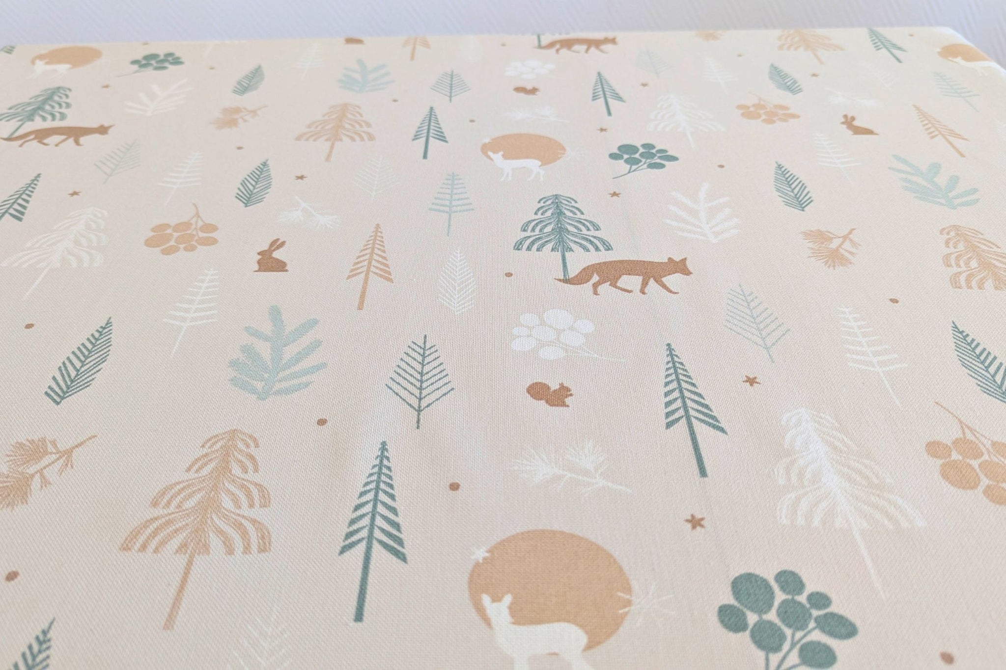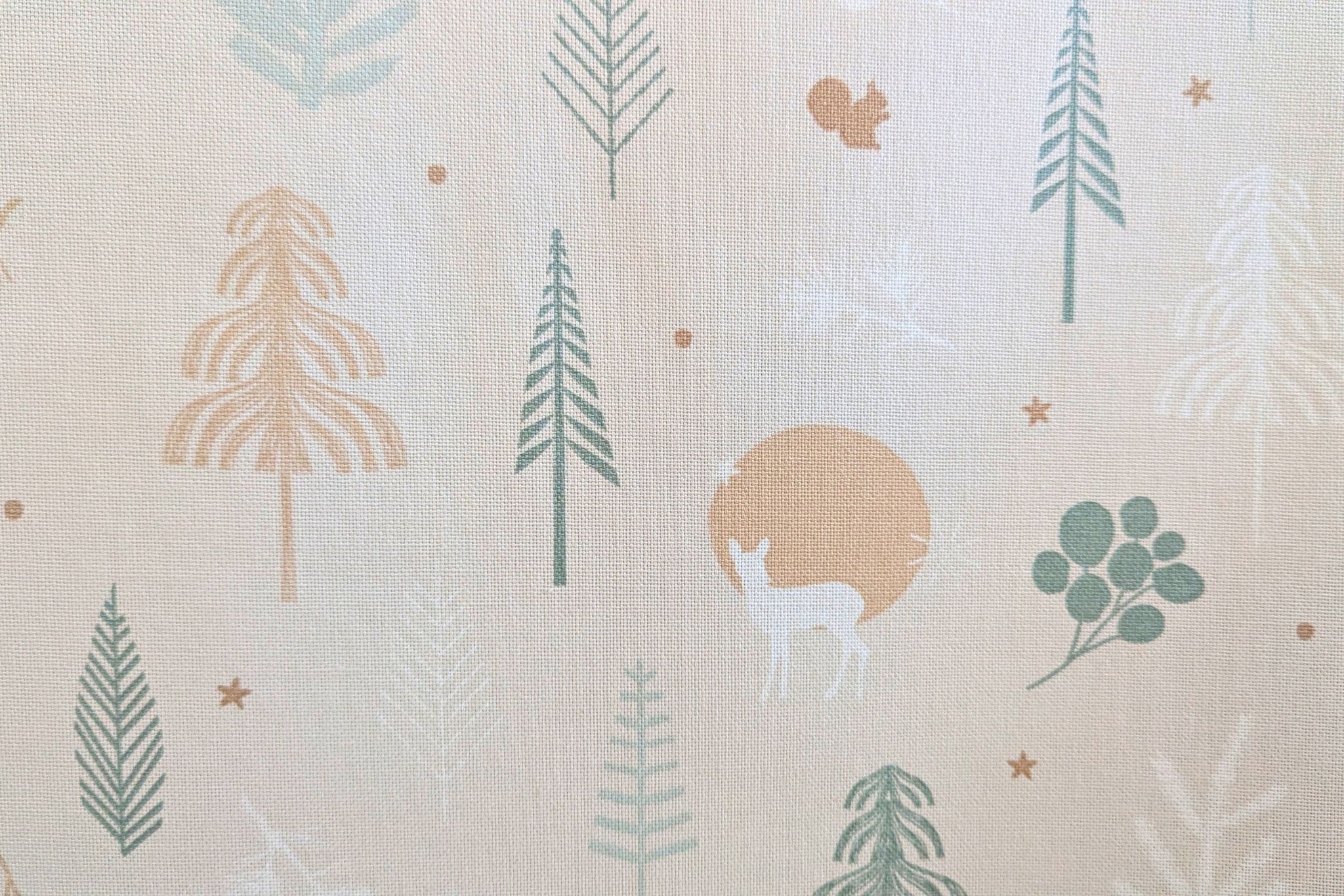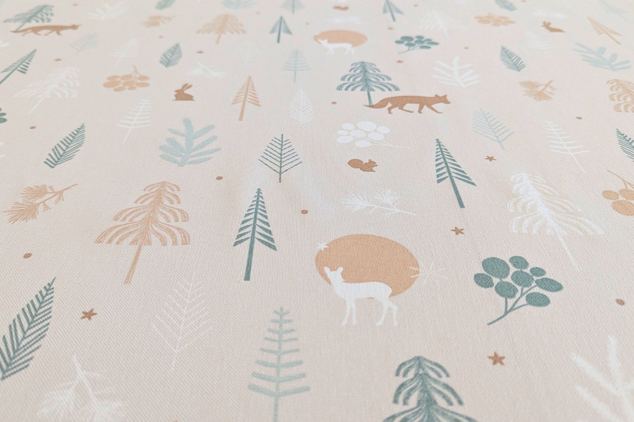 - Design: Leinenoptik mit Weihnachtsieren im kalten Wald