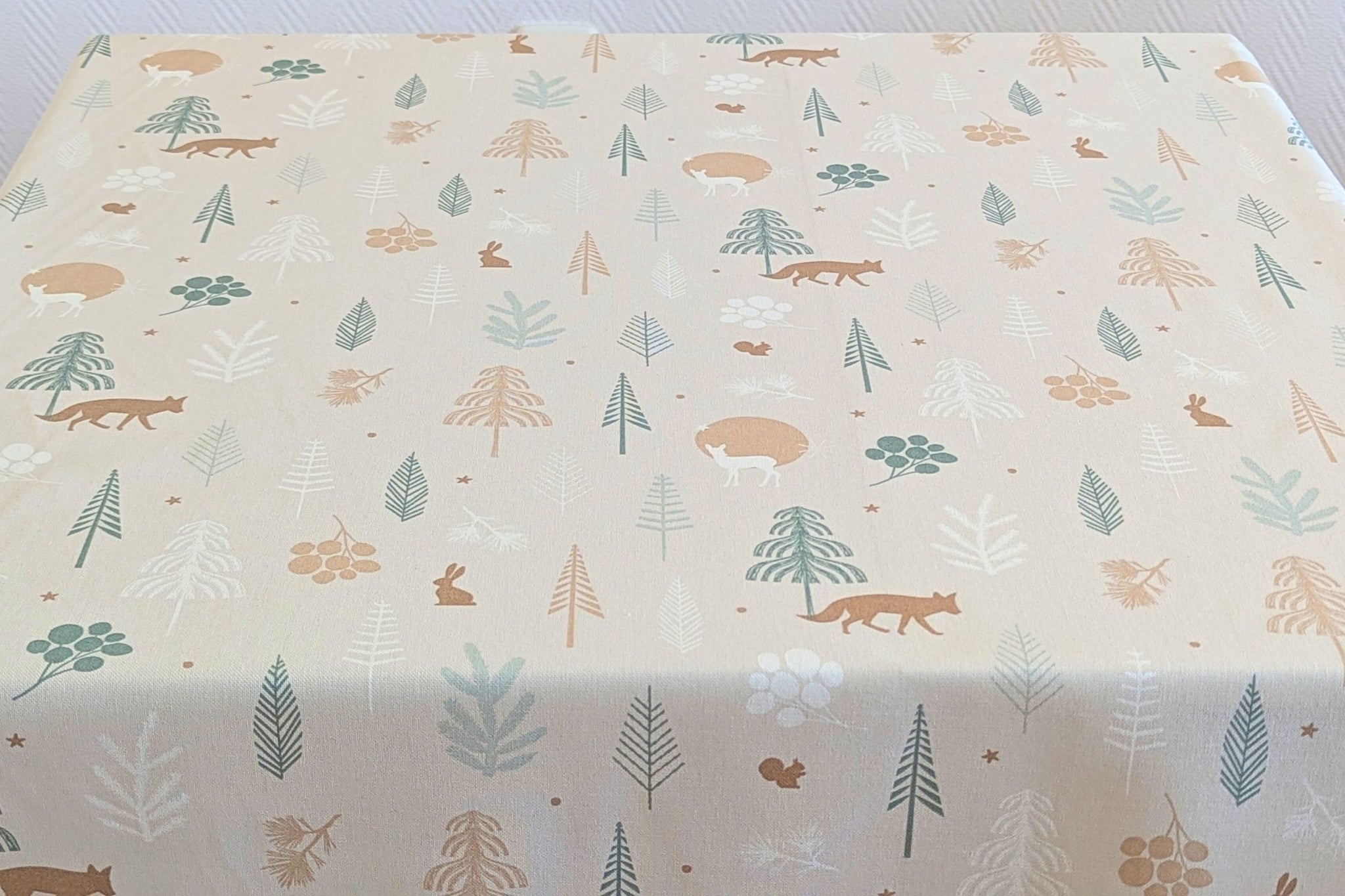 Unsere liebevoll handgefertigte Weihnachtstischdecke und die passenden Tischläufer zeigen eine verträumte Waldszene mit winterlichen Tieren – perfekt, um Kerzenlicht, Weihnachtsgebäck und festliche Getränke stilvoll in Szene zu setzen.