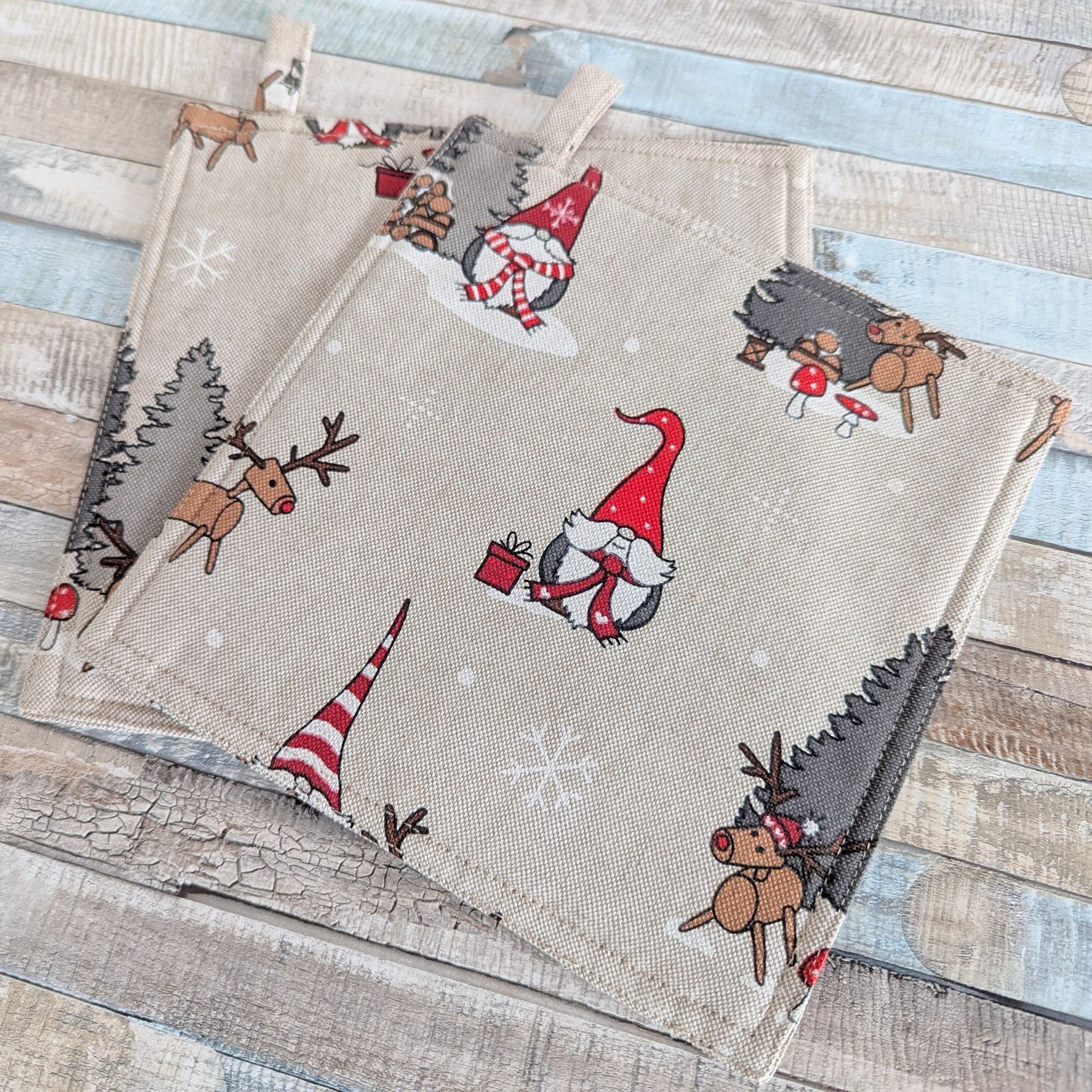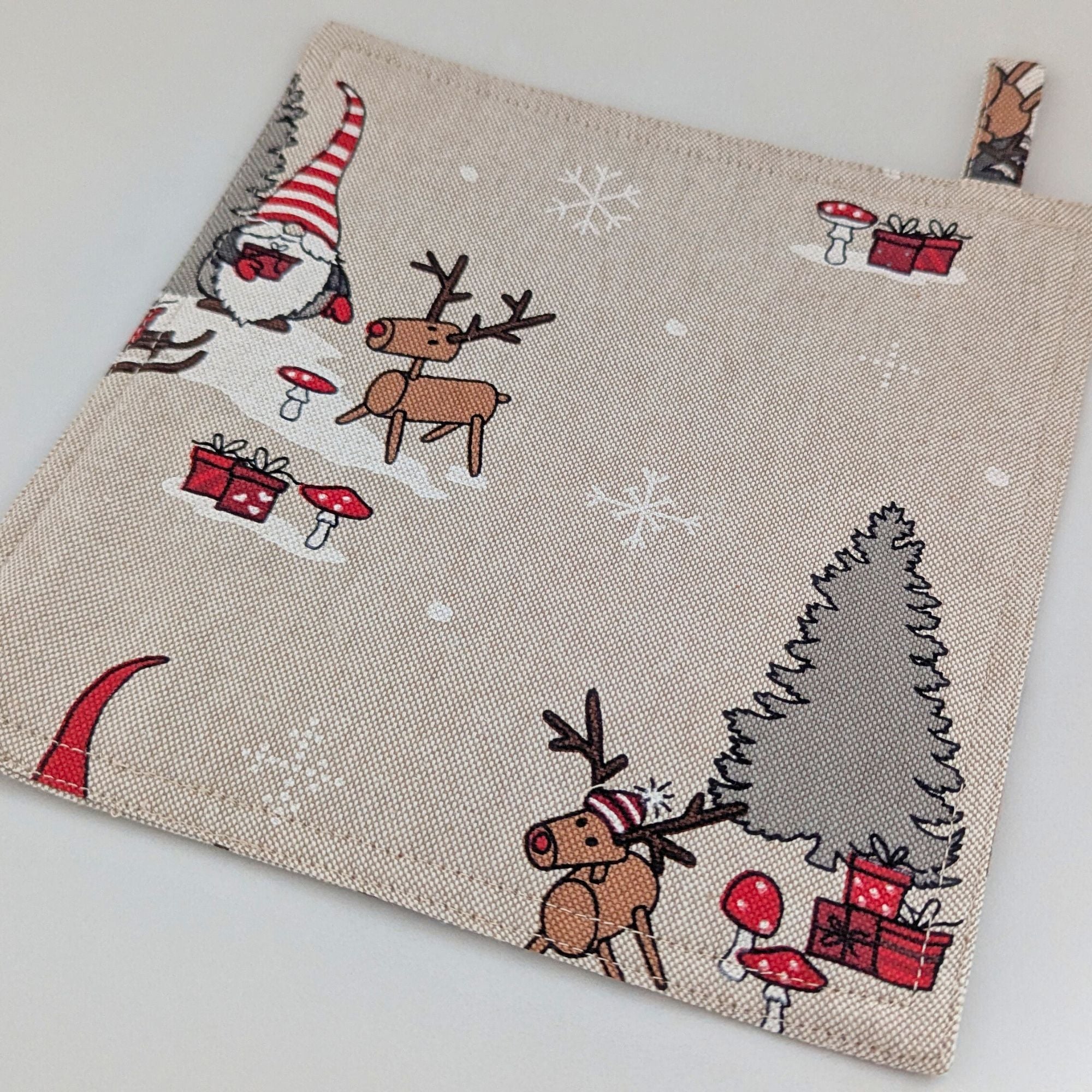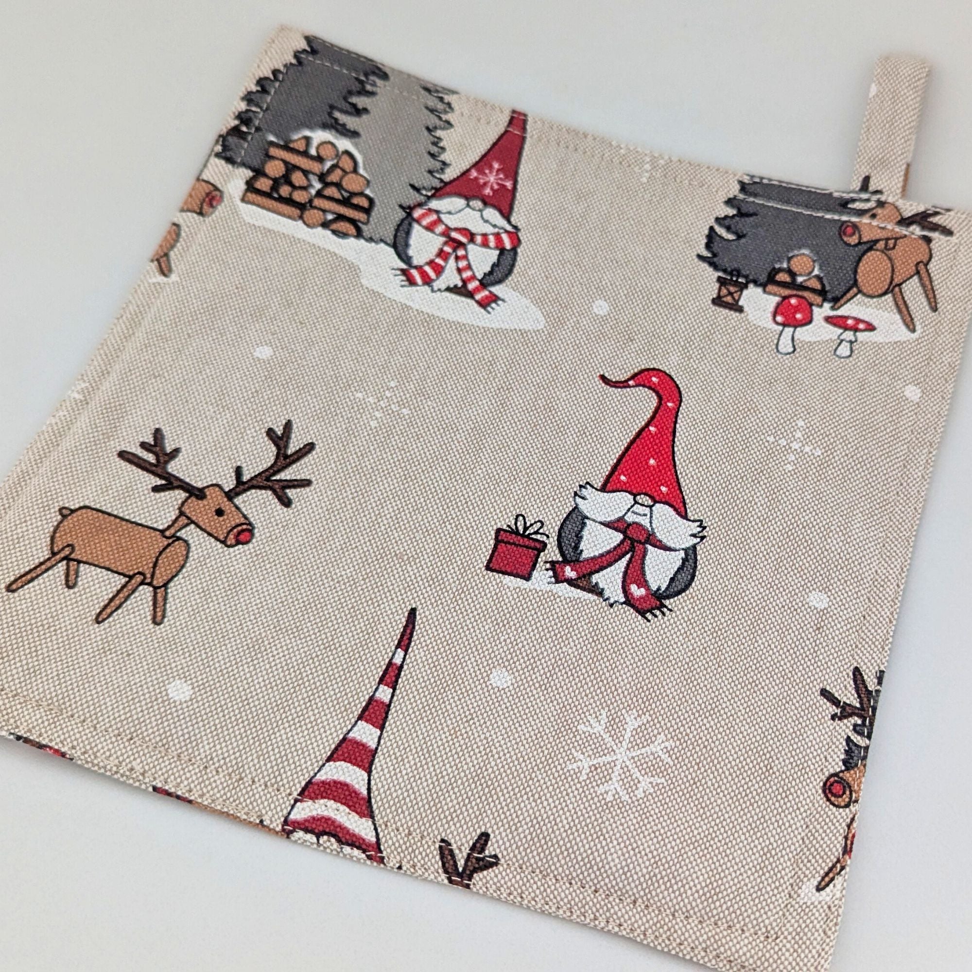 Unsere handgenähten Topflappen mit Wichteln, Rentieren und winterlichen Motiven im schönen Baumwoll-Leinenlook sind nicht nur praktische Küchenhelfer, sondern auch ein liebevolles Dekorationselement für die Adventszeit.