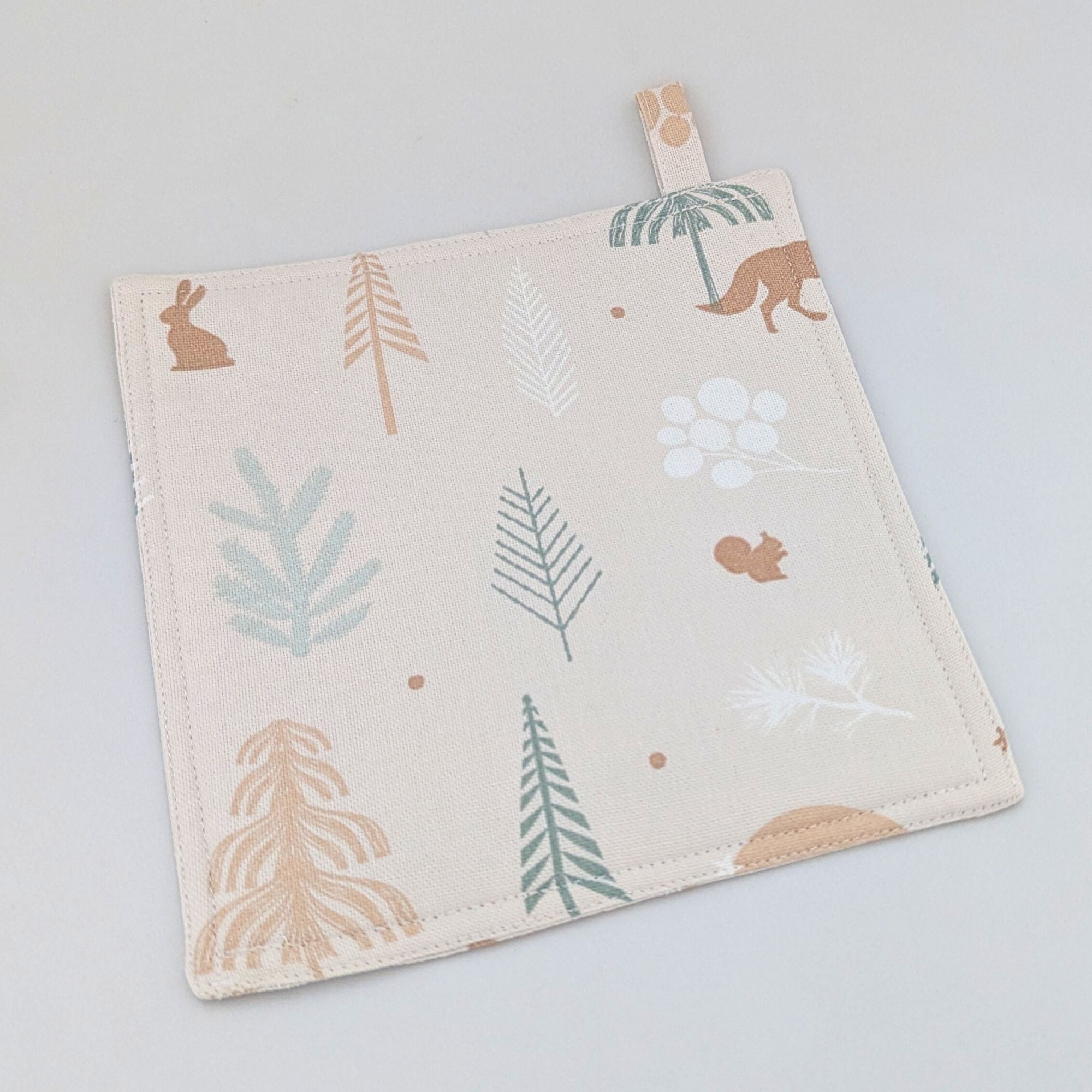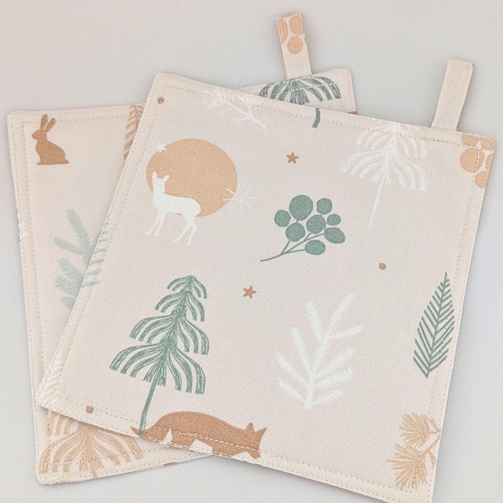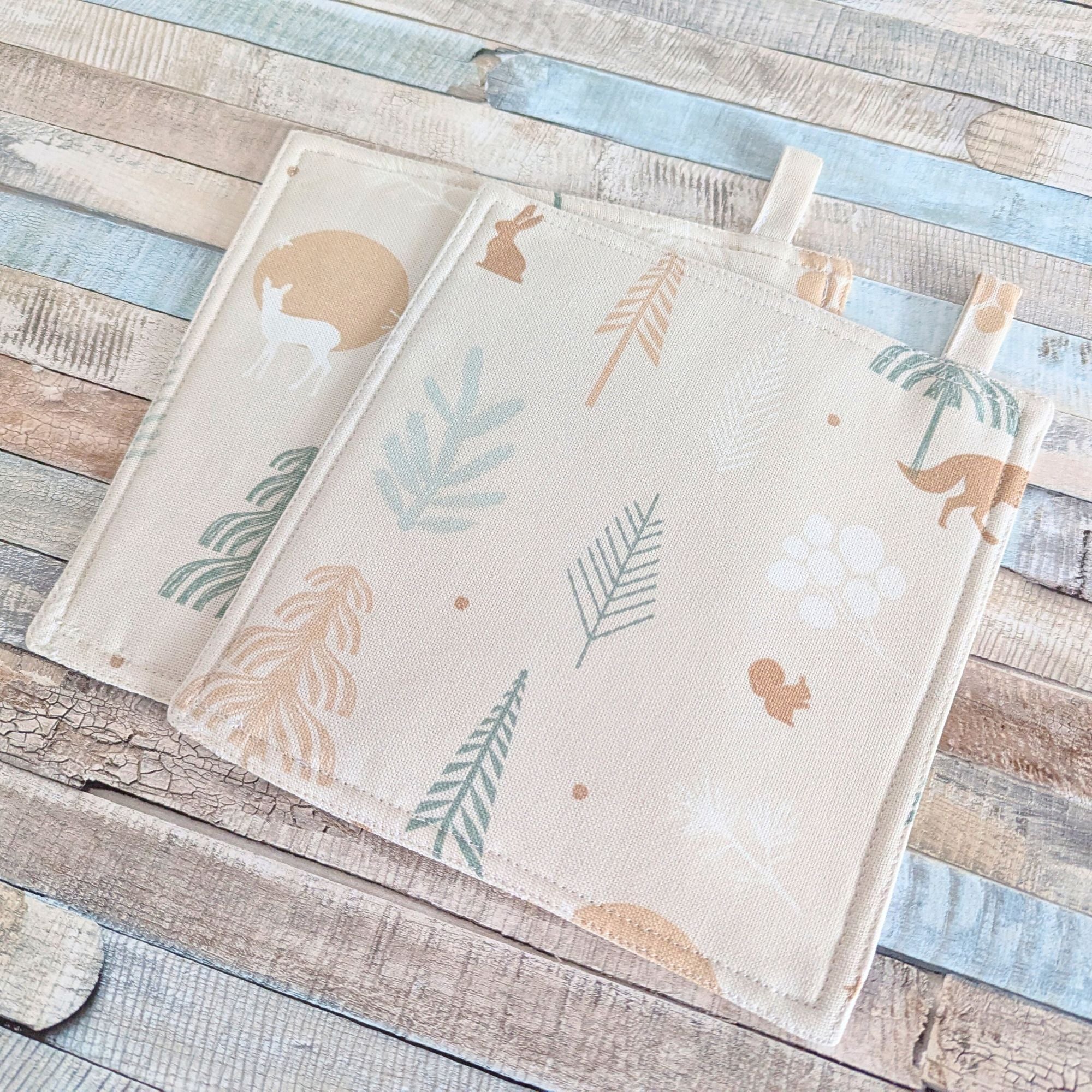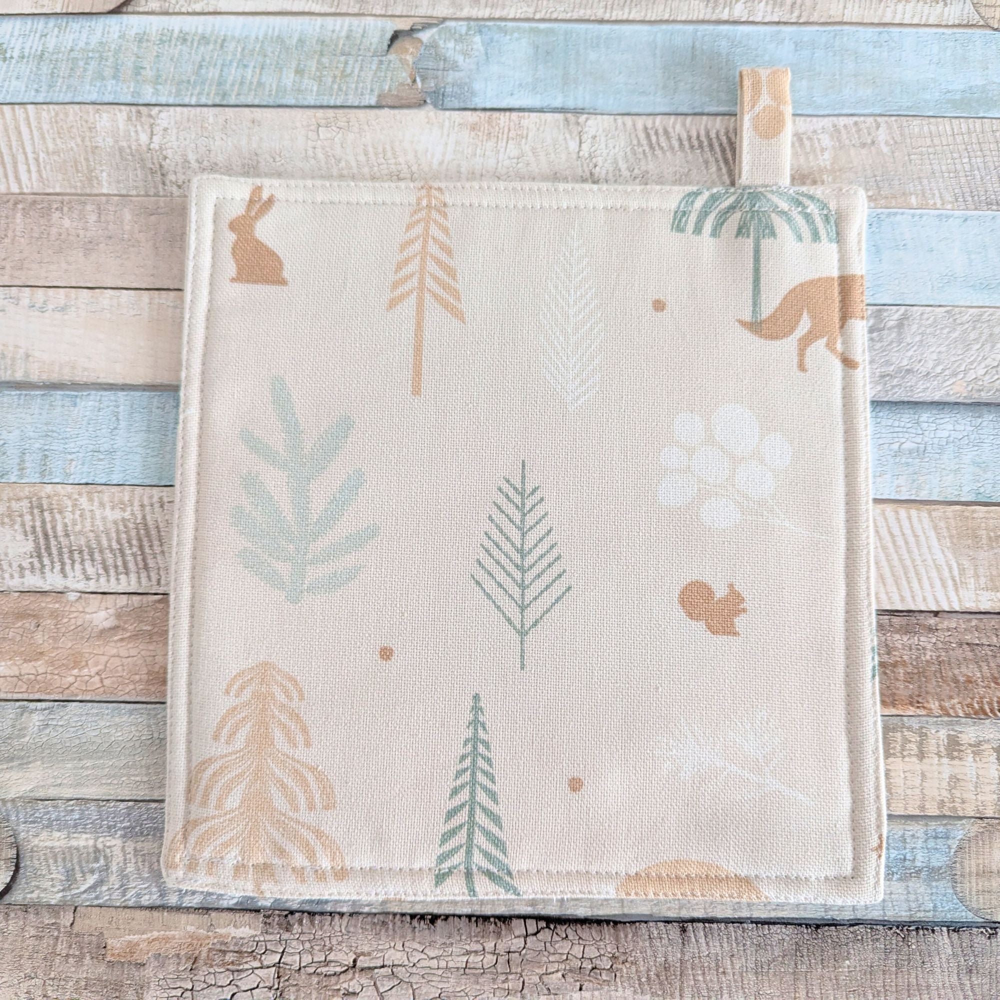 Handgefertigte Topflappen mit Weihnachtstieren im kalten Wald - 2er Set für die festliche Dekoration
